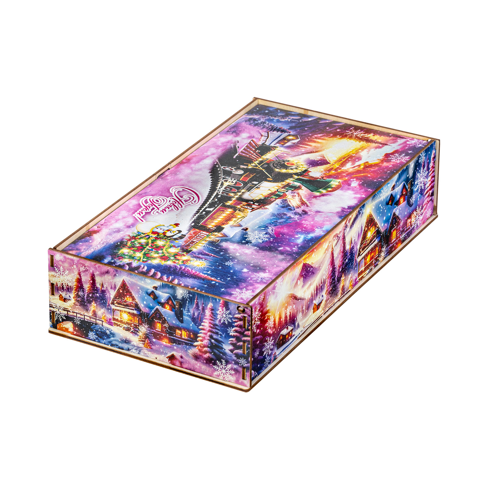 Секрет идеального новогоднего сладкого подарка прост: это яркая привлекательная упаковка и вкусные сладости внутри. “Снежный экспресс” - это подарочный набор, который как раз прекрасно подходит под эти характеристики. Это небольшая деревянная коробчка с очень необычным ярким оформлением. На ней изображен зимний вечер в небольшой деревне, рядом с которой по железной дороге весело мчится праздничный поезд. В этом поезде находятся счастливые люди, которые вот-вот смогут увидеться со своими родными и друзьями и отпраздновать с ними Новый год. В подарочный набор входит килограмм разнообразных сладостей, небольшой памятный сувенир и безграничная радость для всей семьи!